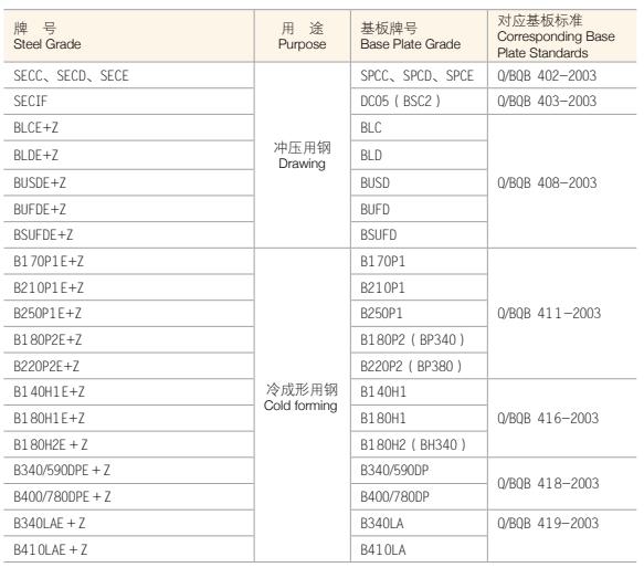 1、電鍍鋅牌號與基板牌號對照表